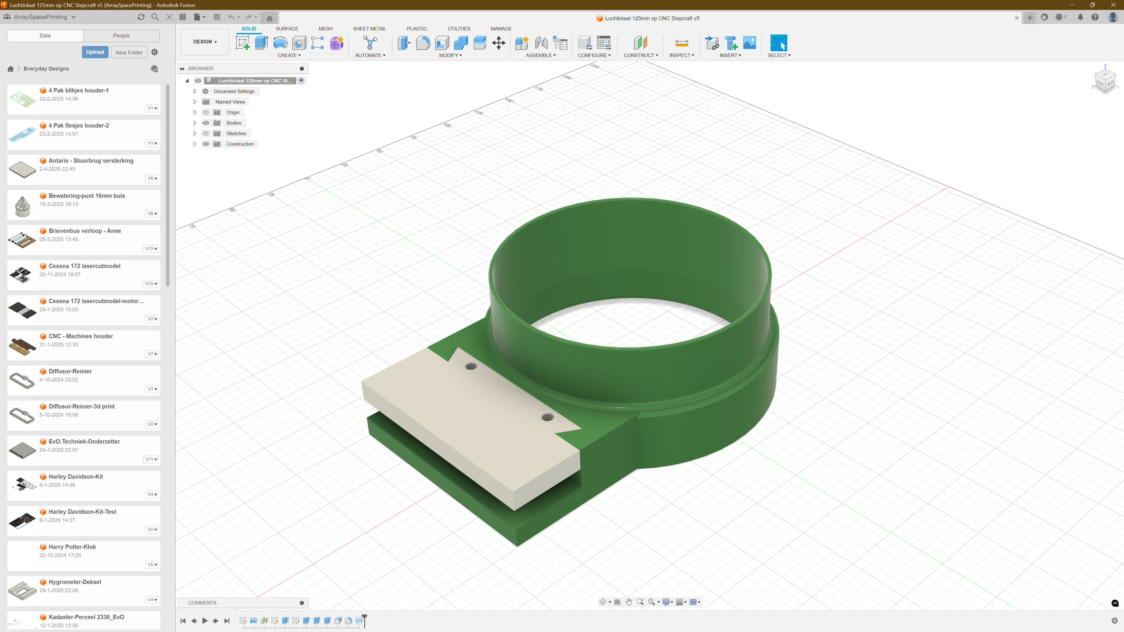 De afbeelding voorbeeld boven tekst is een zelf ontworpen luchtslang aanzuigmond D=125mm voor plaatsing op CNC machine. Hiermee worden schadelijke dampen bij bv lasersnijden, afgezogen uit werkruimte.